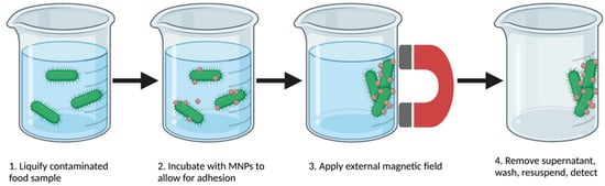In addition to the unique properties outlined previously, MNPs show immense promise in food pathogen detection due to their rapid and low-cost capabilities for the separation of bacteria from complex matrices without the need for centrifugation or filtration []. Although the functionalization and surface modification of MNPs for food pathogen extraction vary widely, most studies utilize the same basic procedure for bacterial extraction [,,,,]. As shown in Figure 2, MNPs are introduced to a liquified food sample that is naturally or artificially contaminated with one or more bacterial species. After MNPs have been evenly dispersed in the liquid, the sample is incubated from one minute to up to an hour to allow the MNPs to adhere to the target cells. After incubation, an external magnet is applied, and the supernatant is removed. Samples can be resuspended in a lower sample volume for bacterial concentration, sometimes after multiple washing steps to remove any remaining food matrix components. Various detection methods using biosensors or PCR can then be implemented [,,,].
