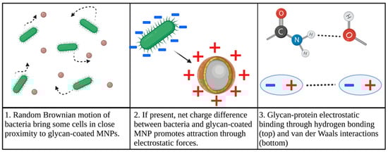 Thus, glycan-coated MNP binding to bacteria in a fluid matrix is hypothesized to be facilitated by a combination of forces, as summarized in Figure 3. Brownian motion, the random and uncontrolled movement of particles in a fluid, can initially facilitate movement that randomly brings cells in close proximity to glycan-coated MNPs [,]. If the coated nanoparticles have a net positive charge, electrostatic forces between MNPs and negatively charged cell membranes can also draw bacteria towards the MNPs [,,,]. Once in close proximity, due to random motion or electrostatic forces, the bacterium can adhere to the glycan surface of MNPs through non-covalent carbohydrate-protein binding, including van der Waals forces and hydrogen bonds [,]. A positively charged glycan coating may improve this adhesion by reducing electrostatic repulsion [].