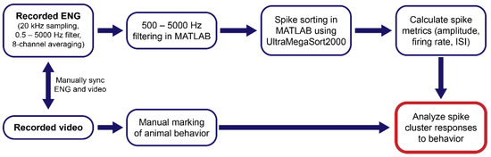 ENG data were imported into MATLAB, where they were further processed. ENG was band-pass filtered from 500–5000 Hz to minimize interference from EMG, ECG, or other possible sources. The filter bandwidth was kept relatively wide to minimize distortion of spike waveforms. Spikes were detected and sorted into clusters using the UltraMegaSort2000 software in MATLAB, using a threshold of eight times the RMS of baseline. Spike waveforms (3 ms long) were transformed into the principal component space, and principal components accounting for 95% of the total waveform variance were used for spike clustering. Spike clustering was done using k-means clustering of spike waveform principal components, with a maximum of k = 256 clusters. Using the UMS2000 software, clusters were further analyzed for better separation and exclusion of artifacts. First, outliers were removed if they had a z-score greater than 500 on the χ2 distribution of distance to the cluster center. Clusters were removed from analysis if the spike waveform contained a second, larger threshold crossing (i.e., removing of spikes which were detected twice due to threshold-crossing of the spike tail). Clusters were also removed if spike width was less than 0.3 ms and amplitude was greater than 1mV (presumed recording artifacts) or if spike width was greater than 2 ms. Spike waveform values were used to calculate spike amplitudes (difference between the maximum and minimum voltage values) and the spike RMS. Spike-cluster-firing timings were also used to calculate cluster-firing rates and interspike intervals (ISI). Average spike amplitudes over time are shown in Supplementary Figure S1, and spike RMS was used to calculate average SNR, shown in Supplementary Figure S2. Animal behaviors (eating, drinking, grooming, and resting) were identified via video recording. The overall data processing and analysis workflow is diagrammed in Figure 2.