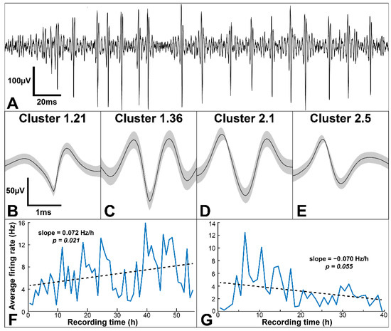 Figure 3. Spontaneous spikes recorded in freely moving animals. (A) Filtered ENG showing example recording spikes. (BE) Example clusters sorted from recorded spikes in two animals. (F,G) Spike firing rate over recording time for two animals. Neither animal had a significant change in firing rate over time.