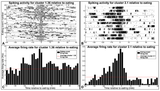 Figure 4. Example spiking activity related to eating. (A) Raster plot for Cluster 1.36. Grey-shaded boxes represent eating events, with dots representing spikes. (B) Raster plot for Cluster 2.1. (C) Firing rate of Cluster 1.36 relative to eating, averaged for all eating events. Red line represents the overall average firing rate of Cluster 1.36. (D) Firing rate of Cluster 2.1 relative to eating.