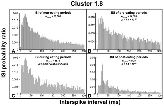 Figure 5. Interspike interval histograms for Cluster 1.8. (A) ISI histogram for noneating periods, which has a peak around 21 ms. (B) ISI histogram for pre-eating periods, which has a peak around 7ms, and a significantly different ISI distribution compared to noneating periods. (C) ISI histogram for eating periods, which has a peak around 23 ms and is not significantly different from noneating periods. (D) ISI histogram for post-eating periods, which has a peak around 21 ms and a secondary peak around 47 ms, and a significantly different ISI distribution compared to noneating periods.