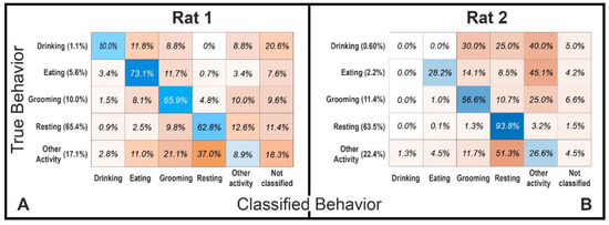 Figure 6. Confusion matrix for classifying animal behavior based on spike firing rates. Blue-colored cells show rates of correct classification, and orange-colored cells show rates of incorrect classification, such that each row sums to 100%. Y-axis labels show the percentage of recording time spent doing each behavior. (A) Confusion matrix for the classification of behavior in Rat 1. (B) Confusion matrix for the classification of behavior in Rat 2.