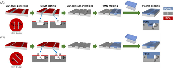 Previously, we reported the fabrication process of a channel with a parallelogram cross-section [17,18]. Photolithography, anisotropic KOH wet etching, plasma bonding, and self-alignment between PDMS and Si were sequentially performed to fabricate channels having parallelogram and rectangular cross-sections, as shown in Figure 2. First, a SiO2 thin film layer of 1000 Å thickness was deposited on a (100) single crystal Si wafer using low-pressure chemical vapor deposition (LPCVD) and patterned by photolithography and RIE (reactive ion etch) (photomask designs are illustrated in Figure S1). Then, the Si wafer was anisotropically etched with KOH solution at 70 °C (etch rate: 0.66 μm/min). The Si channels and the masters for PDMS molds for parallelogram and rectangular cross-sections had the same etching depth, so it was possible to fabricate the Si channel and master for the PDMS mold in one silicon wafer. The width of the channels (W = W1 − W2), which was determined by the photomask design for Si channel width (W1) and master width (W2) for PDMS molds, was fixed to 13.5 μm, and their heights (H) were controlled by KOH anisotropic wet etching time to fabricate the channels with various ARs. A PDMS mold was replicated from the Si master, and then was self-aligned and bonded with the Si channel by oxygen plasma treatment. A small amount of methanol (or DI water) was sprayed between the Si channel and the PDMS mold to facilitate self-alignment, where the PDMS mold could be mechanically aligned to one side wall of the Si channel by hand. Finally, the methanol was evaporated on a hot plate to complete the formation of the channel, which was composed of PDMS and silicon. Since the Si channel and the Si master for the PDMS mold were fabricated on the same wafer, both had the same crystal plane and etching depth (Figure 2). In other words, the geometrical similarity (including depth) between them enabled the easy alignment. The assembled microfluidic device is illustrated in Figure 1A.