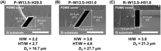 The SEM images showing the cross-section of the fabricated HAR channels. (A) Cross-section of a parallelogram channel with AR lower than 3.5 (AR = 2.2, P–W13.5–H29.5). (B) Cross-section of a parallelogram channel with AR larger than 3.5 (AR = 3.8, P–W13.5–H51.0). (C) Cross-section of a rectangular channel with AR larger than 3.5 (AR = 3.8, R–W13.5–H51.0) (scale bar: 100 µm).