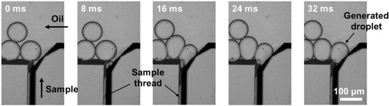 Time-lapse images showing the droplet generation process at the water–oil interface are illustrated in Figure 4. When the sample solution (DI water) was introduced in the HAR channel with a parallelogram cross-section, it was pressurized and formed a thin thread. As the sample solution reached close to the T-junction region, the thin thread pinched off into a droplet. Once the formed droplet was released to an oil-flowing channel, the elongated thread retracted, resumed the initial state, and repeated these steps, resulting in monodisperse droplets being produced periodically (Video S1).