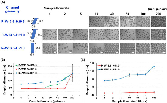 The effect of the channel geometries, such as cross-sectional shapes (parallelogram or rectangle) and ARs (larger or smaller than 3.5), on droplet formation was investigated. The diameters of the droplets created from all the different geometries and flow rate conditions (oil: 400 µL/h, sample: 1, 2, 5, 10, 30, 50, 100, and 200 µL/h) were measured and compared, where all measurement results are summarized in Table 1. It can be seen in Figure 5A,B that the modality of the droplet formation is different in accordance with the channel geometries. For example, when the channel structure with an AR value of less than 3.5 (P–W13.5–H29.5, AR = 2.2) was used, the droplet breakup profile followed a conventional T-junction droplet generation principle, which is governed by the viscous shearing forces between oil and sample solutions. In this case, the size of the produced droplet was strongly dependent on flow variations, where larger-diameter droplets were formed as the faster flow of the sample solution was applied (Video S2). In the P–W13.5–H29.5 channel design, the average diameter of the droplets was 46.2 µm under the sample flow rate of 10 µL/h, and then their sizes began to increase as the sample flow rates became larger, where droplets with an average diameter of 146.3 µm were created under a sample flow rate of 200 µL/h.