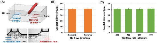 The effect of the carrier oil flow on droplet generation. (A) Illustration and microscopic images showing the droplet generation under two different flow directions of the oil solution (forward: towards a device outlet; reverse: towards an oil inlet) (scale bar: 100 µm). (B) Comparison of the average droplet sizes produced under two different oil flow conditions (sample flow rate: 50 µL/h; oil flow rate: 400 µL/h). (C) Analysis of the average droplet sizes formed under various oil flow rates (200, 400, 600, and 800 µL/h, sample flow rate was fixed at 50 µL/h).