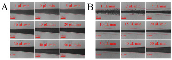 In this section, we studied whether the added fluid viscoelasticity facilitated the focusing of blood cells. The blood sample diluted in only PBS was selected to be the control, which is labelled as CPEO = 0 ppm. We first compare it with whole blood diluted in 500 ppm PEO PBS solution. Figure 2 presents the distribution of blood cells after the serpentine region of the channel for the two cases, at the same blood concentration (1/10) and volume flow rates ranging 1 to 50 µL/min. The side walls of the microfluidic channel are identified in each test with a dashed line overlay. As observed, the added viscoelasticity from PEO facilitated the focusing of blood cells. For blood sample of CPEO = 0 ppm, even with 10 times dilution, the cell-free layers are very narrow. However, the cell-free area is increased by the viscoelastic effect at certain range of flow rates for blood samples of CPEO = 500 ppm. Furthermore, the total width of free cell layers first increases and then decreases with the increase of flow rate (Figure 2B), which indicates that the enhancement of cells focusing by viscoelasticity is also sensitive to flow rate.