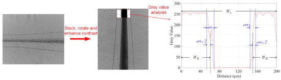 where Wf denotes the total averaged cell-free layer width, which is the sum of the two cell-free layer widths Wf1 and Wf2 nearby channel walls. Wc represents the channel width. To calculate Wf, we first stacked each frame of the micrographs into a single figure. A rectangular region of interest was then selected at a discrete point before the expansion. Finally, the profile of grey values along the channel’s width was obtained to determine the cell-free area with the error areas considered. Figure 3 illustrates the process using the data from the 1/10 blood concentration and 500 ppm PEO at flow rate of 10 µL/min as an example. Since the greyscale value of 0 represents black, it is not difficult to determine the widths of the error areas (err1 and err2), and then the total width of cell-free layers on two sides Wf can be estimated, so as δ.