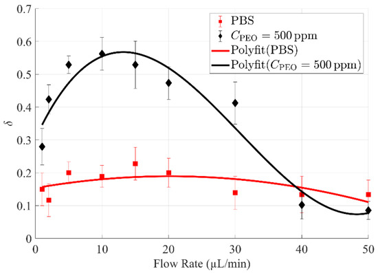 By repeating the procedures above, the effect of flow rate on the cell-free area ratio δ can be obtained (Figure 4). As presented, the cell-free area ratio δ of 10 times diluted blood in 500 ppm PEO PBS is significantly higher than that in only PBS at low to moderate flow rates (1~30 µL/min), while a narrowed cell-free area ratio δ was found at high flow rates (40 and 50 µL/min). Importantly, a peak value of δ was identified for the focusing performance of 10 times diluted blood in 500 ppm PEO PBS, as demonstrated by the fitting curve. Specifically, when the flow rate was 10 µL/min, δ of 10 times diluted blood in 500 ppm PEO PBS was at its highest value of approximately 0.56, which is more than two times of the peak δ value (around 0.23) of PBS.
