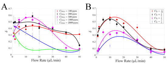 We further investigated the effects of PEO concentration and blood dilution on blood cells’ focusing performance. Various PEO concentrations and blood dilutions demonstrated a similarly peaked response (Figure 5); the cell-free area ratio δ generally shows an initial increase and subsequent decrease when flow rate increased, except for the case with the highest PEO concentration (CPEO = 2000 ppm) which demonstrates a consistently decreasing trend. Additionally, low PEO concentrations (CPEO = 100, 200, and 500 ppm) demonstrated superior performance compared to counterparts with high PEO concentration (CPEO = 1000, 2000 ppm). Specifically, the highest δ was approximately 0.44 of CPEO = 100 ppm at 15 µL/min, 0.58 of CPEO = 200 ppm at 15 µL/min, and 0.56 of CPEO = 500 ppm at 10 µL/min. In general, optimal δ were found within low to moderate flow rates, and this optimised flow rate decreased from 15 to 1 µL/min when CPEO increased from 100 to 2000 ppm (Figure 5A). Furthermore, among the various blood dilution cases, the 10 times diluted blood consistently shows a superior effect to others, as presented in Figure 5B. This is not unexpected, since larger dilution has fewer cells, thus leading to larger cell-free layers. Similarly, optimal focusing performances were found within low to moderate flow rates ranging from 5 to 15 µL/min. Among all the cases, the highest cell-free area ratio δ was approximately 0.58 with 200 ppm PEO concentration and 10 times diluted blood at 15 µL/min.