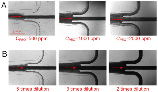 Focusing of blood cells and plasma extraction at the bifurcation outlets: (A) 10 times diluted blood with various PEO concentrations; (B) various blood dilutions with 200 ppm PEO concentration.