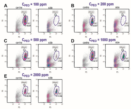 After determining the optimal viscoelastic focusing at 15 µL/min, the blood plasma separation was conducted for diluted blood samples (1/10) with different PEO concentrations and the collected plasma from the different outlets was examined. Figure 7 displays the flow cytometric data for central and side outlets for increasing PEO concentration, where gated regions identify RBCs populations and eBeads. Absolute cell counts (n) in the RBCs region increased for samples collected from the side outlet for the blood sample with PEO concentration ≥500 ppm.