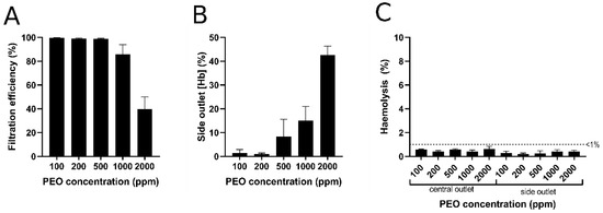 Filtration efficiency as determined by comparative RBCs counts (A) and relative total haemoglobin concentration (B) of the side outlet versus central outlet of the microfluidic device for each PEO concentration. (C) Measured cell-free haemoglobin (i.e., haemolysis) at the central and side outlets of the microfluidic device for each PEO concentration. (Hb): haemoglobin concentration. Error bars represent standard error of the mean (n = 3).