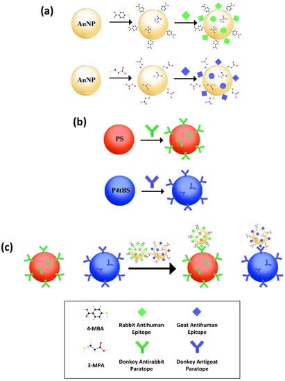 The SERS-coded nanotags were prepared by the formation of different self-assembled monolayers (SAMs) of functional thiols on AuNP surfaces. Here, the solution of 4-MBA or 3-MPA (2.5 µL, 10−3 M) was added separately to 1 mL of the above AuNP suspension under vigorous stirring for 2 min at room temperature, and the mixture solution turned purple. The resulting SERS nanotags were washed three times by operating centrifugation and redispersing cycles, and finally redispersed in 100 µL DI water. Hereafter, two different sets of epitopes (rabbit antihuman IgG and goat antihuman IgG) were separately attached to the performed SERS-coded nanotags via ionic and hydrophobic interactions [43]. Then, 5 µg of epitopes in phosphate buffer were separately charged to these 100 µL SERS-coded nanotag suspensions under gentle rotation at room temperature for 2 h. Then, 100 µL of 10% BSA solution was added to the mixtures and rotated for another 30 min, followed by three-time washing using DI water. The final epitope coupled SERS-coded nanotags (aka. SERS-coded reporters) were then redispersed in 100 µL DI water and stored at 4 °C.