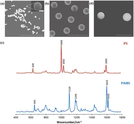 SEM images of monodisperse (a) PS and (b) P4tBS microbeads. (c) Raman spectra of these two Raman-coded microbeads with their characteristic wavenumbers labelled. (d) A typical SEM image of the immunocomplexes (SERS-coded reporters on the surface of Raman-coded microbeads formed through specific epitope-paratope interaction).