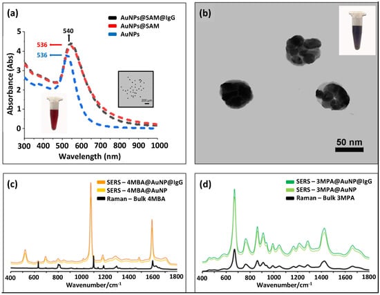The details of preparing the SERS-coded reporters are illustrated in Figure 1; SERS-coded nanotags were used to report the specific paratope–epitope interaction in the immunoassay analysis. The AuNPs used to prepare SERS-coded nanotags were synthesized at a 1:2 feed molar ratio of HAuCl4·3H2O and Na3Ct to achieve sufficient surface citrate ions and good colloidal stability. The localized surface plasmon resonance (LSPR) of the ~25 nm AuNPs showed a characteristic absorption peak at 525 nm (Figure 3a). The same amount of SERS-active molecules of 4-MBA and 3-MPA were separately mixed with AuNPs to produce the SERS-coded nanotags; the thiol groups of 4-MBA and 3-MPA had a strong affinity to the AuNPs, and carboxylic acid groups enhanced colloid stability [49]. The 4-MBA and 3-MPA formed SAM on the AuNPs via the Au–S bond, and an inevitable aggregation took place immediately after the SAM formation due to hydrophobic interaction [50]. The aggregates formed “hotspots” and facilitated strong SERS signals. The successful formation of SAM can be signified by an absorption-peak redshift to 536 nm upon addition of 4-MBA and 3-MPA [51]. The TEM image could be further used to identify the formation of SAM on the AuNPs and hotspots (Figure 3b); each aggregate contained several small AuNPs. Model epitopes of rabbit antihuman IgG and goat antihuman IgG were then mixed with the 4-MBA or 3-MPA SERS-coded nanotags separately to form two distinct SERS-coded reporters, and 10% BSA was used as a blocking solution to avoid future nonspecific bounding in bioanalysis. No redshift in the LSPR of the SERS-coded nanotags after epitope coupling indicated their core–shell–corona structure, in which the hydrophilic corona layer further enhanced the stability of the SERS-coded nanotags in aqueous solution.