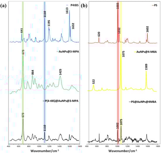 (a) Raman spectra of paratope-conjugated P4tBS microbeads, epitope-coupled AuNP@3-MPA SERS-nanotags, and the resulting immunocomplexes after the specific paratope and epitope interactions. (b) Raman spectra of paratope-conjugated PS microbeads, epitope-coupled AuNPs@4-MBA SERS-nanotags, and resulting immunocomplexes after the specific paratope and epitope interactions.