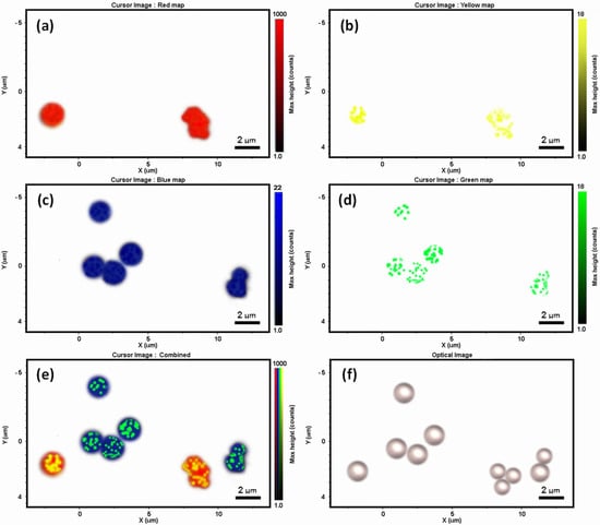Raman imaging of the multiplex assays. (a–d) Raman images of PS microbeads (red) and 4-MBA SERS-reporters on PS microbead surface (yellow); P4tBS microbeads (blue) and 3-MPA SERS reporters on P4tBS microbead surface (green). (e,f) Combined false-colored spectroscopic and optical images of dry PS and P4tBS microbeads with their specific SERS reporters from immunoassays.