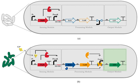 - Zhang, G.; Hu, S.; Jia, X. Highly Sensitive Whole-Cell Biosensor for Cadmium Detection Based on a Negative Feed-back Circuit. Front. Bioeng. Biotechnol. 2021, 9, 1251. [Google Scholar] [CrossRef] [PubMed]