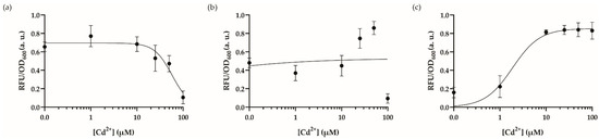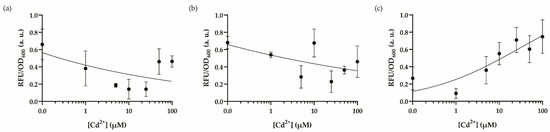 Dynamic range analysis of the engineered cadmium biosensor by changing the cell inoculum. The dynamic range analysis of the recombinase-based cadmium sensor in MOPS media with cell dilutions (a) 1:100, induced in 96-well plates, (b) 1:250, induced in 96-well plates, (c) 1:50, incubated at 30 °C until OD600 reaches to 0.4–0.6, then transferred and induced in 96-well plates. All cultures were induced with cadmium ion concentrations from 0–100 μM and incubated for 20 h at 30 °C in a stable incubator. The fluorescence intensity of each group was compared with each other and 0–1 normalized according to the formula stated in the Materials and Methods section. Data were visualized with mean ± standard error mean (SEM) in each graph. At least three biological replicates were used for each analysis. The point on the y-axis (0.0) represents the uninduced condition/background signal.
