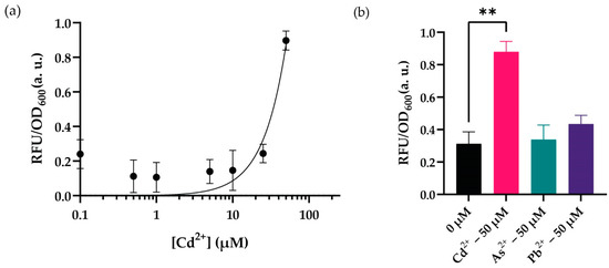Following optimization, we set up an experiment to verify our hypothesis to test our sensor in its optimal working conditions described previously. Our results showed that the sensor responded to increasing cadmium concentrations in optimal working conditions in 10 h; nevertheless, the system did not respond to cadmium concentrations lower than 50 µM (Figure 5a). The peak concentration that maximized the signal output was 50 µM cadmium. Then, we decided to test the recombinase-based sensor’s activity against other selected (II) charged heavy metal cations (i.e., arsenic and lead) since previous investigations had revealed a cross-reactive nature for the MerR family of transcription factors such as CadR [38]. The sensors seem to have a background signal for arsenic and lead ions; however, we did not observe this behavior to create a reasonable signal at 50 µM of cadmium concentration, which is the optimum response point for our system (Figure 5b). The sensor’s signal-to-noise ratio of increased cadmium ion concentration had a more significant fold change; nevertheless, testing with other heavy metal ions revealed a basal signal for our sensory system.