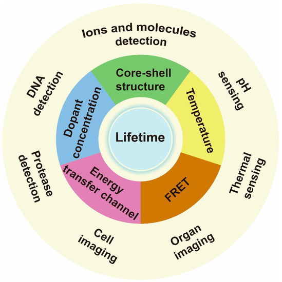 Schematic illustrations of lanthanide-doped nanoparticle lifetime regulation for biosensing. The approaches to regulating lifetime include varying core–shell structure, dopant concentration, energy transfer channel, temperature and setting a fluorescence resonance energy transfer (FRET) system. The relevant applications include ions, molecules, DNA, protease, thermal and pH sensing, as well as cell labeling and organ imaging.