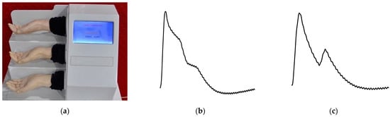 To verify the reliability, consistency, and effectiveness of the flexible compound sensor, we employed a standard pulsation signal source, the MM-4 pulse simulator, shown in Figure 7a. The equipment based on bionic simulation and waveform synthesis methods, develops bionic hands and radial artery blood vessels with polymer material formulas, and uses stepping speed-regulating motors and special oil pumps to simulate the dilation and contraction of the human heart. It can output a variety of standard finger-sensing real pulse wave signals at the radial artery of the bionic hand. We can set the shape of the pulse wave independently. Figure 7 shows the pulse shapes called Ping, Xian, Hua, Ji, and Chi generated by the pulse simulator, which are considered as the five common pulse sharps in TCM.