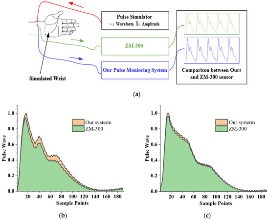 To evaluate the effectiveness of the flexible compound sensor, we compared the sensor we proposed with the sensor on the ZM-300 [1], which meets TCM’s technical standards for pulse wave detection, and is generally considered to be a standard pulse wave detection system. A verification experiment is designed, as shown in Figure 11. The pulse simulator is used to generate the five most common specific waveforms in TCM to simulate the pulse wave of the human body, and then let our proposed sensor and the ZM-300 sensor measure. The default unit of the output value of the ZM-300 sensor is g/cm2, which is converted to kPa to keep the unit consistent with the output value of our sensor. Then, the ratio of the amplitude of the waveform captured by the two sensors is calculated. We have measured five kinds of pulse, namely Ping, Xian, Hua, Ji, and Chi. For each group of pulse waveforms, and we tested them ten times.