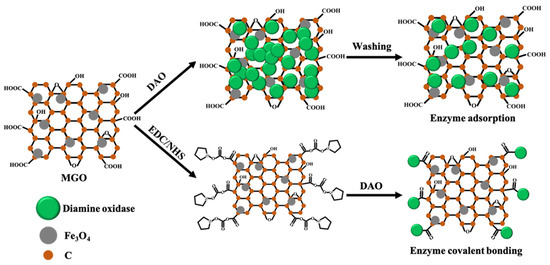 The strategy for immobilizing DAO is shown in Figure 1. The adsorption method uses physical adsorption, especially electrostatic adsorption, to immobilize DAO on the MGO [26]. The covalent bonding method activates the -COOH group of MGO through EDC/NHS, and then the -COOH group combines with the -NH2 group of DAO to form a covalent bond and immobilize on the MGO [27].