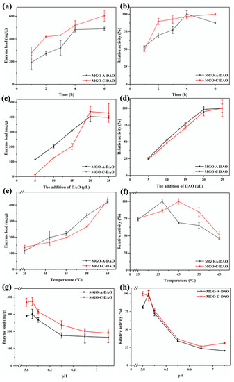 As shown in Figure 2a,b, the enzyme loading and relative enzyme activity of MGO-A-DAO initially increased as the immobilization time increased, and then reached a maximum at 4 h. The possible reason was that the MGO material could not provide more binding sites for DAO. As the immobilization time was further extended, the steric hindrance of the enzyme increased and the enzyme activity decreased [30]. Therefore, the optimal immobilization time of MGO-A-DAO was 4 h. In contrast, the enzyme loading capacity of MGO-C-DAO increased with the extension of the immobilization time in this study, because there were many -COOH groups on the surface of MGO, providing enough binding sites for enzyme immobilization. However, its relative enzyme activity did not change much within the immobilization time from 2 to 6 h, and only increased by 11%. Therefore, 2 h was selected as the optimal immobilization time for MGO-C-DAO.