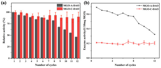 Reusability of MGO-DAO (a) relative enzyme activity (take the first enzyme activity as 100%) and (b) enzyme activity.