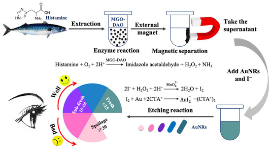 Figure 4 shows a schematic diagram of the colorimetric biosensor based on magnetic DAO and AuNRs for the detection of histamine in fish, and the evaluation of fish freshness. The characterization of the synthesized AuNRs is shown in Figure S4, with a longitudinal adsorption peak of 658 nm, and average length and width of 57 and 28 nm, respectively. As shown in the schematic diagram, the histamine extracted from the fish samples was decomposed under the catalysis of MGO-DAO to produce H2O2. Then, under the intervention of Na2MoO4 which has a peroxidase-like activity, I− could be quickly reduced to a strong reducing agent of I2 by H2O2, which could etch AuNRs longitudinally. This would lead to a blueshift in the longitudinal adsorption peak of AuNRs, companied by a series of color changes in the solution. The higher the histamine content, the more obvious the etching of AuNRs and the greater the longitudinal peak blueshift.