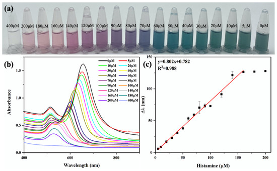 Histamine detection curve: (a) color change picture; (b) UV−VIS absorption spectrum (400–900 nm); (c) standard curve for histamine detection.