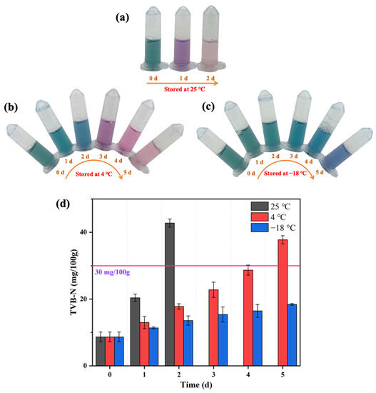 Evaluation of the freshness of mackerel stored at 25 °C (a), 4 °C (b), and −18 °C (c) by the proposed biosensor and changes of TVB-N content of mackerel stored at different temperatures (d).