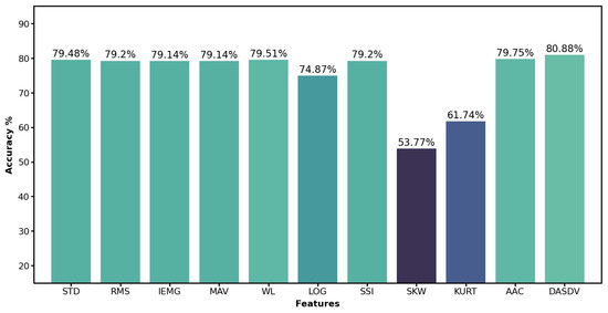 To assure the recognition accuracy by using proper features, we tested eleven commonly used features, which were Standard Deviation (STD), Root Mean Square (RMS), Integrated EMG (IEMG), Mean Absolute Value (MAV), Waveform Length (WL), Log Detector (LOG), Simple Square Integral (SSI), Skewness (SKW), Kurtosis (KURT), Average Amplitude Change (AAC) and Difference Absolute Standard Deviation Value (DASDV) [21]. We dropped three lowest performance features, whichwere LOG, SKW and KURT and chose the rest eight with the highest accuracy as the final features for the following research. The performance of these features are shown in Figure 1. After applying the eight features to the sEMG signals, the data set was converted from 12 columns to 96 columns. Due to the sensor hardware issue mentioned in the first subsection, the sEMG data of subject S024 was changed from 11 columns to 88 columns.