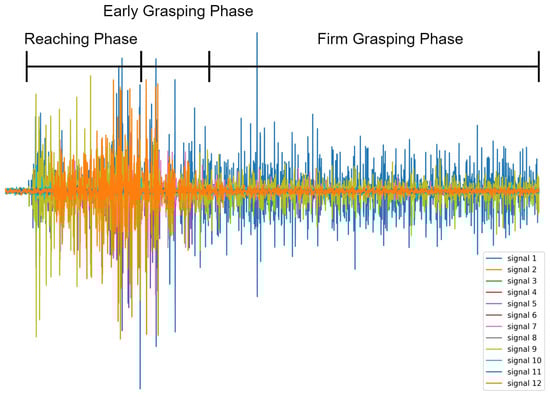 Notice that the sEMG signal is more active in the Reaching and Early Grasping phases with high amplitude of the sEMG waveform as shown in Figure 2. This is because the hand starts to perform the corresponding grasping gestures related activities such as hand aperture, where the sEMG signals from the forearm are usually active with higher amplitude than other phases [26], although the hand has not grasped to the object during the Reaching Phase. In contrast, starting from the mid-Early Grasping phase to the whole Firm Grasping Phase, the muscle status keeps relatively unchanged, which makes the amplitude sEMG signal slightly lower than that in the reaching and grasping phase; this is also why better grasp classification performance was achieved during the Early Grasping phase and the Firm Grasping Phase where the sEMG signal patterns are relatively similar.