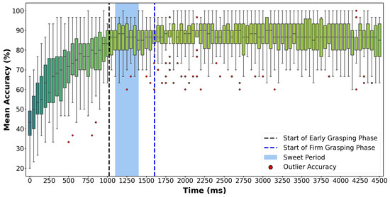 Mean accuracy at each time point during the entire grasp period. This result is from the model which was trained using all three phases data using leave-one-repetition-out cross-validation, and the mean accuracy represents the average accuracy of 30 subjects. The blue region, starts from 1100 ms and ends from 1400 ms, is the sweet period which was confirmed from the first experiment. The vertical dashed lines are averaged starting times of Early Grasping and Firm Grasping phases, which locates at 1020 ms and 1604 ms, respectively. The red dots are outliers.
