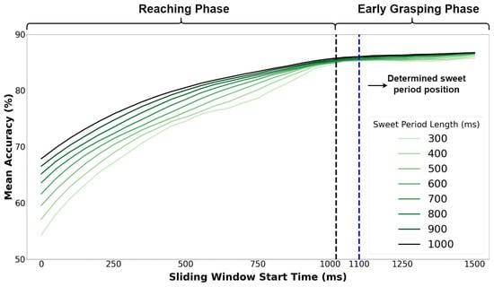From Figure 4, we can see that the mean accuracy increases with the increase of window length significantly during the Reaching phase and beginning of the Early Grasping phase (at about 1100 ms) but not significantly afterward. For instance, although the window length of 1000 ms can reach the highest accuracy of 86.3%, it takes a much longer time than the length of 300 ms with an accuracy of 85.5%. Therefore, the length of the sweet period is set as 300 ms, and the position is set from 1100 ms to 1400 ms, which makes it entirely located in the Early Grasping phase as the blue region shown in Figure 3.