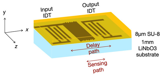 We chose LiNbO3 36Y-X as the substrate material because its high electromechanical coupling coefficient allowed the immersion of IDTs covered by a polymer in liquids [17]. The substrate is efficient in its conversion from mechanical and electrical domains compared to other substrate options, such as quartz. On the other hand, the high electromechanical coupling coefficient allows the design of compact devices that require fewer finger electrodes in IDTs, which results in smaller delay paths (center-to-center distance of IDTs), which is desirable to further minimize the effects of the losses of a polymeric guiding layer.