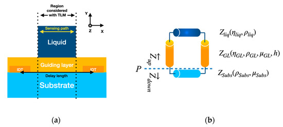 The acoustic transmission line model (TLM) considers the effects of viscosity in the layers that form the Love wave sensor (Figure 3a) [11,19]. The approach is mathematically analogous to the transmission lines of electromagnetic waves [20,21]. The TLM considers layers represented by a characteristic impedance given by the properties and type of the medium (Figure 3b). This medium can be viscoelastic solids, Newtonian liquids, or rigid solids. The propagation of the acoustic waves in the layers is described by Equations (1) and (2),