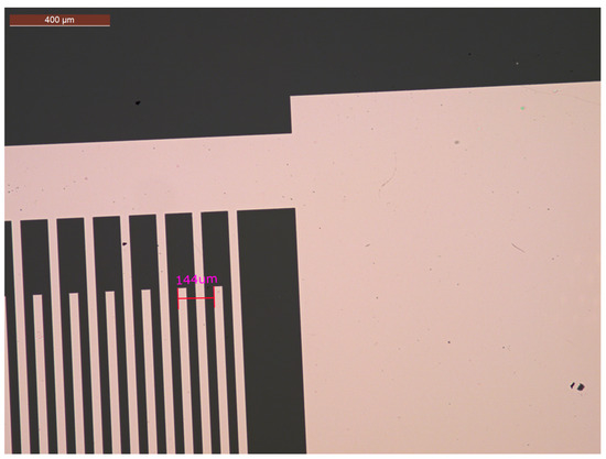 The transducers were made of simple IDTs orientated for propagation in the X-direction of the LiNbO3 36Y substrate. The IDTs were composed of 12 fingers with a period of λ = 144 µm, 3 mm (21λ) aperture, delay path of 5.33 mm (37λ), and metallization-grounded sensing path of 2 mm (14λ). They were fabricated with microlithography patterning. The delay path was orientated to be coincident with the x-axis of the piezoelectric substrate. The sensor IDT design was implemented in the Layout Editor software 2019 (Juspertor GmbH, Unterhaching, Germany). Quartz-aluminum patterned lithography masks were used in this case. The main lithography process is shown in Figure 4.