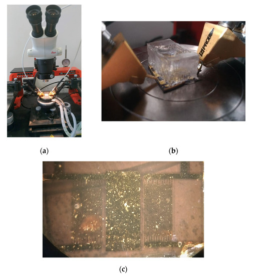 (a) The characterization system consisted of the probe station PM5 SÜSS MicroTec with holder temperature control, two rf-probes (Z-Probe P004 Cascade Microtech Inc., Cheshire, CT, USA), 50 ohm coaxial cables, and an Agilent-5230A vector network analyzer. (b) A fabricated sensor in the probe station during the characterization of glycerol-water solutions. The Z-probes are in contact with the IDT contact pads of the sensor. (c) A device fabricated during an experiment with cell culture media in the fluidic chamber.