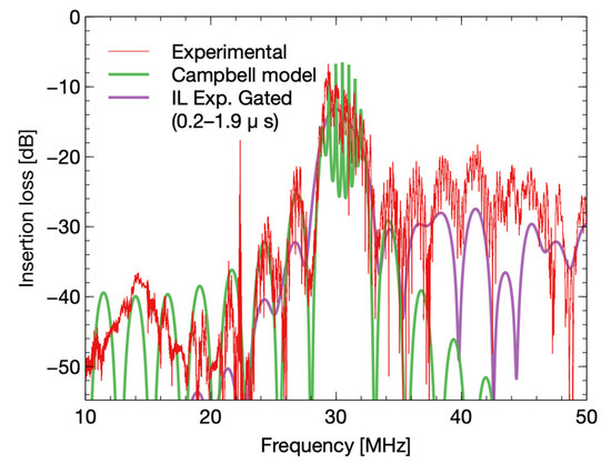 The IDT responses from simulation and the experiment are shown in Figure 8. The responses show noise variations at a frequency around 30 MHz due to triple transit effects of acoustic waves. Figure 8 shows the experimental response (purple curve) after filtering with a window of 0.2 µs to 1.9 µs (curve: IL Exp. Gated). The main noise variations were effectively removed with filtering in the time domain with an insertion loss level of −12 dB.
