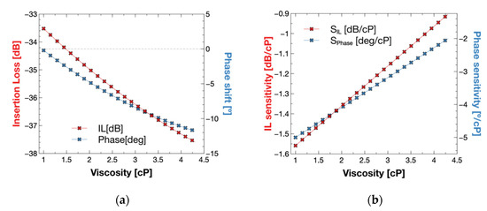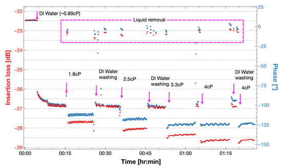 The response of the sensor to viscous liquids is shown in Figure 10. It is observed that both phase and insertion loss shifted to negative values after insertion of a viscous solution, and that the values stabilized after a short time. At a time of around 5 min, the sensor loading was changed from air to a 0.89 cP liquid showing the highest shift in IL of −4.7 dB and in phase of −110°. After 10 min, the responses were stabilized at −26.8 dB and −100°. Around minute 15, the chamber liquid was removed, and the insertion loss level recovered to −23 dB and the phase to −5°. The response of the different viscosities shifted in the same direction but with higher values. Intermediate steps to wash the fluidic chamber with DIW are also shown in Figure 10. Between 0.89 cP and 4 cP, we depict a shift of 1.73 dB and 23° for the phase shift.