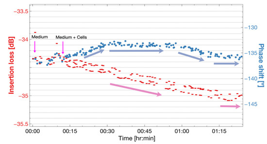 Experimental insertion loss and phase response of the Love wave sensor under changes of 1 mL of cell culture medium with SaOs−2 cells. Once the use of solution with cells commenced, an increase in the insertion losses was observed and an initial positive shift in the phase flipped to a negative shift.