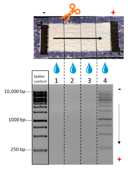 - Li, X.; Luo, L.; Crooks, R.M. Low-Voltage Paper Isotachophoresis Device for DNA Focusing. Lab Chip 2015, 15, 4090–4098. [Google Scholar] [CrossRef] [Green Version]