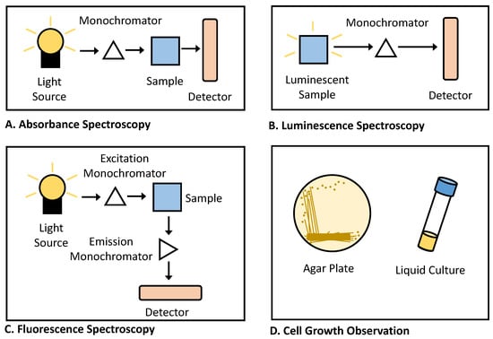 Diagrams of common instrumentation used in bacterial biosensor detection. (A) Absorbance spectrophotometers are often used to detect changes of colored dyes, such as the appearance of blue color following cleavage of X-gal by the reporter lacZ. (B) Luminescence detectors are used to monitor the activity of different types of luciferase reporter genes. (C) Fluorimeters are used to monitor the presence of fluorescent proteins (such as GFP). (D) Cell growth can be assessed either by counting colonies on solid agar plates or by measuring the absorbance at 600 nm of liquid cultures.