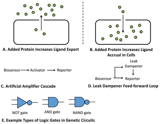In addition to biosensors and their associated reporters, additional genes can also be introduced into bacteria to improve sensor function. These added elements can typically be divided in two categories: genes that alter analyte concentrations within the cell (changing biosensor input), and genetic circuits that alter the relationship between the biosensor and its reporter (changing biosensor output). Regarding the first category, changing the steady-state concentration of an analyte inside cells provides a method for shifting a biosensor’s operational range (Figure 6A). In one example, Raman et al. reduced the sensitivity of the tetracycline biosensor tetR through the addition of the transmembrane pump tetA [137]. In a later work, Johnston et al. reduced the sensitivity of a Rho-based bicyclomycin biosensor in a similar fashion, utilizing the efflux pump bcmT [166]. To shift the operational range in the other direction (Figure 6B), Tang et al. incorporated the transporter fucP to improve cellular uptake of d-arabinose, thereby increasing the sensitivity of the biosensor araC [93]. Miller et al. later used a different strategy to increase the sensitivity of the macrolide biosensor mphR by adding the phosphotransferase mphA into cells, with phosphorylation of macrolide analytes increasing their concentration inside the cells by preventing their outward diffusion [167]. As these examples illustrate, modifying the analyte concentrations inside cells can be used to significantly alter a biosensor’s operational range. However, prior applications of this strategy have each leveraged prior knowledge of characterized proteins that recognize specific analytes. This requirement may consequently limit the use of this approach across other biosensor systems.